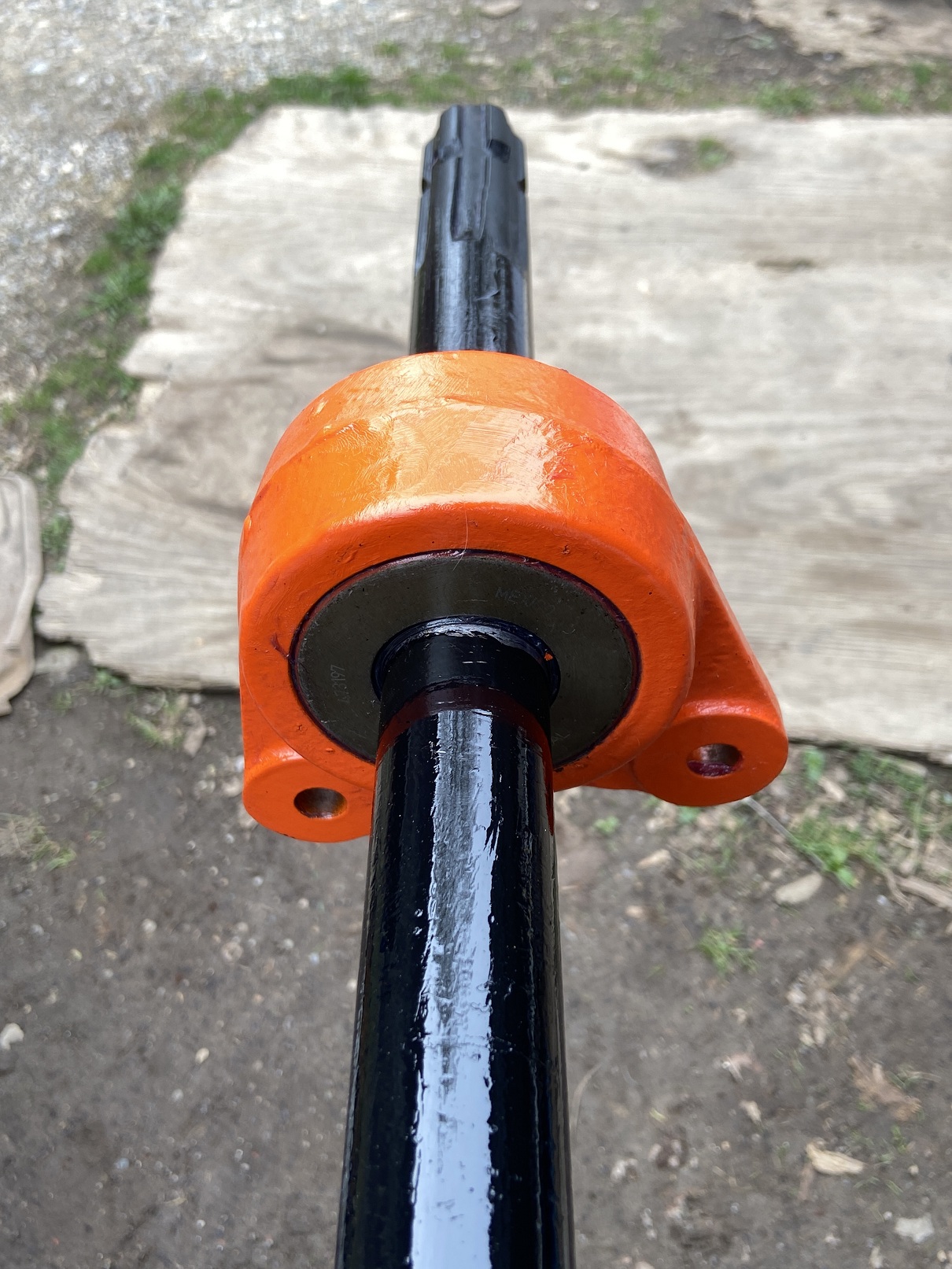 One down, one to go. The bearing is packed with grease along with the extra area between the bearing and new seals. I cleaned the PTO shaft and brushed it with black rustoleum. Not one sees the shaft anyway. All ready for a summer of mowing grass with a 6ft brush hog.