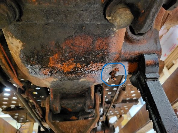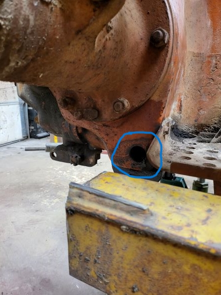 Inside that hole is a pin with an Oring on it. The setscrew you see is what keeps it from falling out. This pin is the lower pin for the lift arm internal ram. Draining the rear end oil totally and pulling the pin and rolling on a new Oring is the fix. I think you have to disassemble the right brake to get access to that pin. And then I wonder about reinstalling the pin when the cylinder has had the pin pulled out. Usually, I had the lift arm housing removed to repack the cylinder and install a new hose and put a new Oring on the pin then.